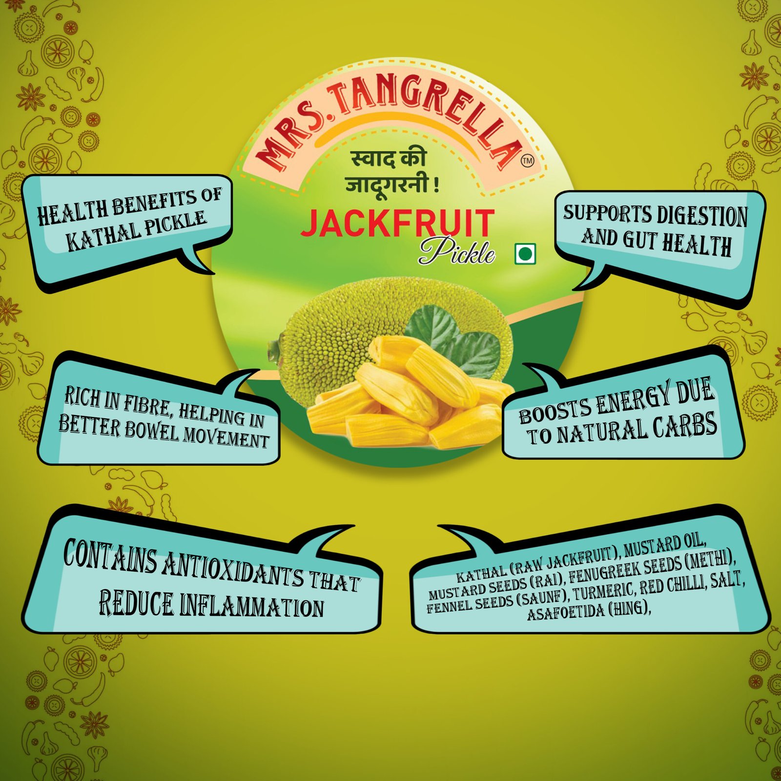 | Speciality | A bold and flavorful pickle made from tender jackfruit, offering a perfect blend of traditional spices and hearty texture in every bite. |